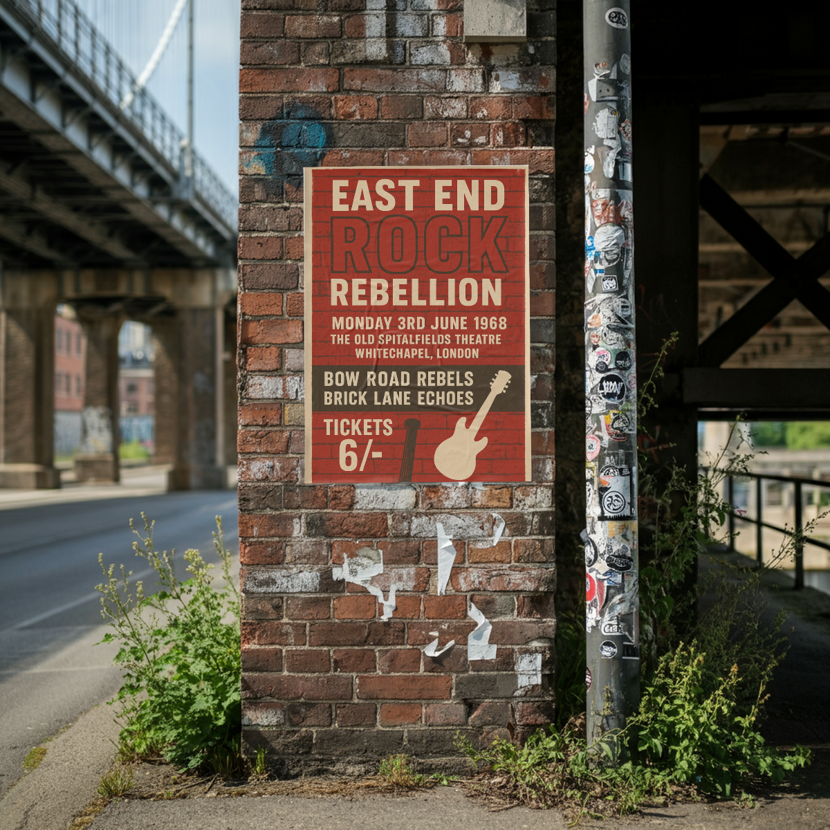 Celebrate the gritty energy of London’s late-60s rock scene with our East End Rock Rebellion 1968 vintage poster print. With bold brick-wall graphics, striking typography, and a retro guitar silhouette, this design captures the rebellious spirit of Whitechapel’s underground rock movement. Perfect for fans of classic rock, collectors of vintage posters, and anyone who loves East London’s musical heritage.