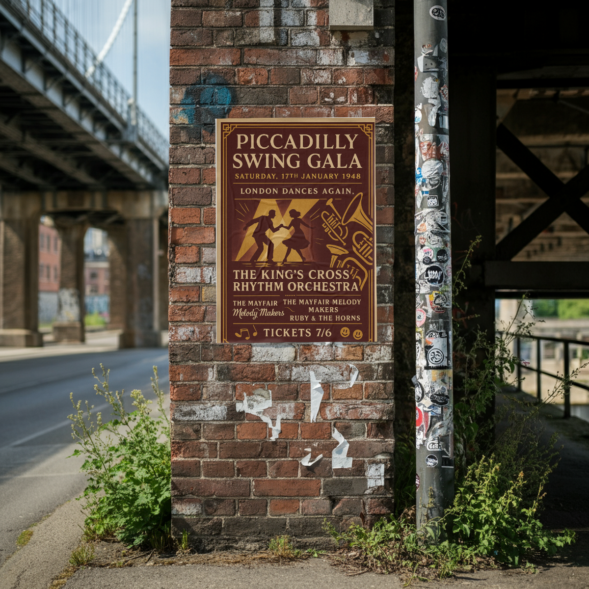 Step back into post-war London’s dance halls with our Piccadilly Swing Gala 1948 vintage poster print. Featuring elegant art-deco style typography, jazz instruments, and dancing silhouettes, this artwork celebrates the golden age of swing and big band rhythm in the heart of the city. Perfect for jazz enthusiasts, collectors of vintage décor, and anyone who loves the energy of classic London nightlife.